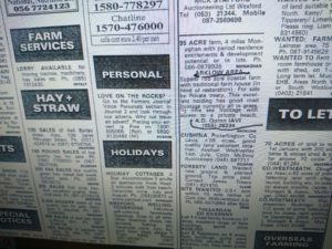 , Journal Advert 26 June 04 Journal Advert 26 June 04I don’t think any of us could ever have imagined how the advert was going to work, and that it had landed just right underneath Nick Stafford’s We know now it was on the 1st September 2004, that Caroline spotted Nick Stafford’s C150-C250 acre farm wanted in any part of County Wexford for client. We now know the Advert David placed in The Farmers Journal landed right under Nick Stafford’s own advert and caught his attention. We decided to take advantage of the Advert and Caroline rang him he came up one Saturday to collect a map of the property to inspect it for his client and we chatted generally about property the day he called up to our home, he was talking about the late John Roberts who died in 2009 and in October 2004 he asked me would I meet his client John Hobson down at the farm and I wasn’t that far away in Arklow at the time, so I agreed to meet them out there at Kilmichael, John Hobson had a long wheelbase silver Toyota l Land cruiser jeep, and Nick Stafford had a maroon coloured Landrover Freelander jeep which I think was a 2002 Registration, I knew John fairly well from the time we both lived in Avoca. John is Deaf and mute but quite easy to communicate with. I thought John was just being a little silly when he wrote down that he had to get thirty million for his seventy acres in Rathdrum, as I had a fair idea of some of the land he had in a couple of different parts on the way up to Rathdrum. It was only in early February 2013 that I heard he had got 82.7 million for his land at Kilbride Arklow, which he sold to Mr. Bill Mulrooney. I had noticed that Stafford had another farm wanted advert 350-500 acre Residential in any part of County Wexford on the 6th October 2004 for his client with upwards of